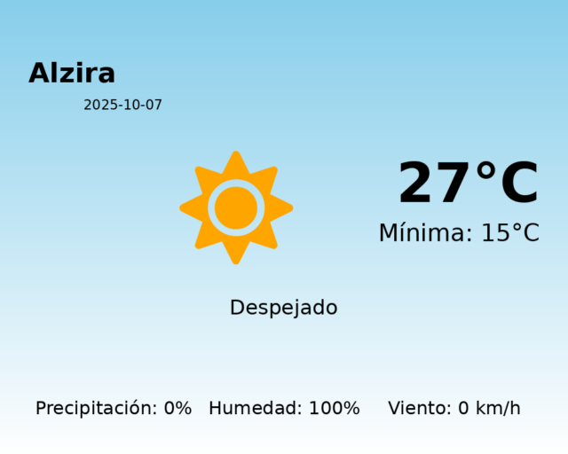 Para hoy, 7 de octubre de 2025, Alzira nos ofrece un día bastante otoñal con temperaturas agradables y condiciones atmosféricas definitivas de la temporada. Aunque las temperaturas varían, el clima general promete ser favorable para quienes disfruten de actividades al aire libre.