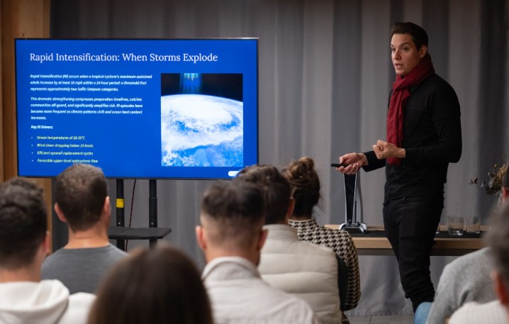 El meteorólogo estadounidense Ariel Rodríguez, de Telemundo Florida, ha aprovechado su primera visita al Principado para compartir su exposición en la que ha profundizado en la formación y organización de los huracanes, así como en los mecanismos que explican su repentina intensificación, un fenómeno cada vez más frecuente en un contexto de cambio climático. Además, la jornada ha contado con una charla telemática de Carlo Buontempo, director del Servicio de Cambio Climático de Copernicus (C3S) de la Unión Europea, que ha presentado Global Climate Highlights, aportando una visión sintética y actualizada del estado del clima a escala planetaria.