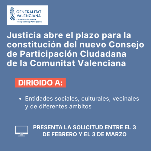 La Conselleria de Justicia, Transparencia y Participación ha señalado la apertura del plazo para la presentación de candidaturas al nuevo Consejo de Participación Ciudadana en la Comunitat Valenciana. Este proceso, que comenzará el 3 de febrero y finalizará el 3 de marzo, busca incorporar a diversas entidades ciudadanas con el objetivo de fortalecer la democracia participativa.